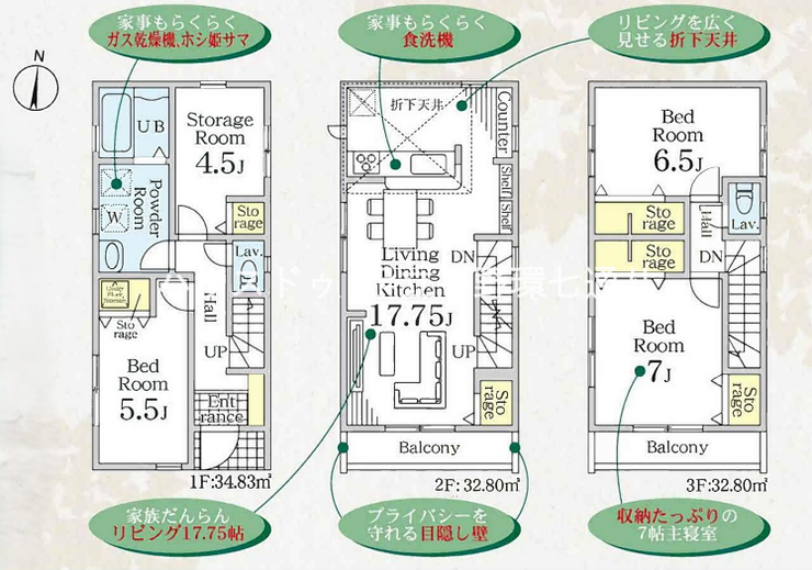 | 備考 | 新築分譲住宅、3SLDKの間取り。リビングは約17.75帖で、ご家族で過ごす空間として利用しやすい広さです。対面式キッチンを採用し、家事動線にも配慮された設計。各居室に収納スペースを備え、納戸(サービスルーム)もあり用途に応じた使い分けが可能です。駐車スペース2台分あり(車種による)。バルコニー付きで通風にも配慮されています。最寄りは東武伊勢崎線「谷塚」駅徒歩13分。周辺には教育施設や生活施設が点在しています。設備や仕様、完成状況、詳細条件等はご確認ください。 | ||